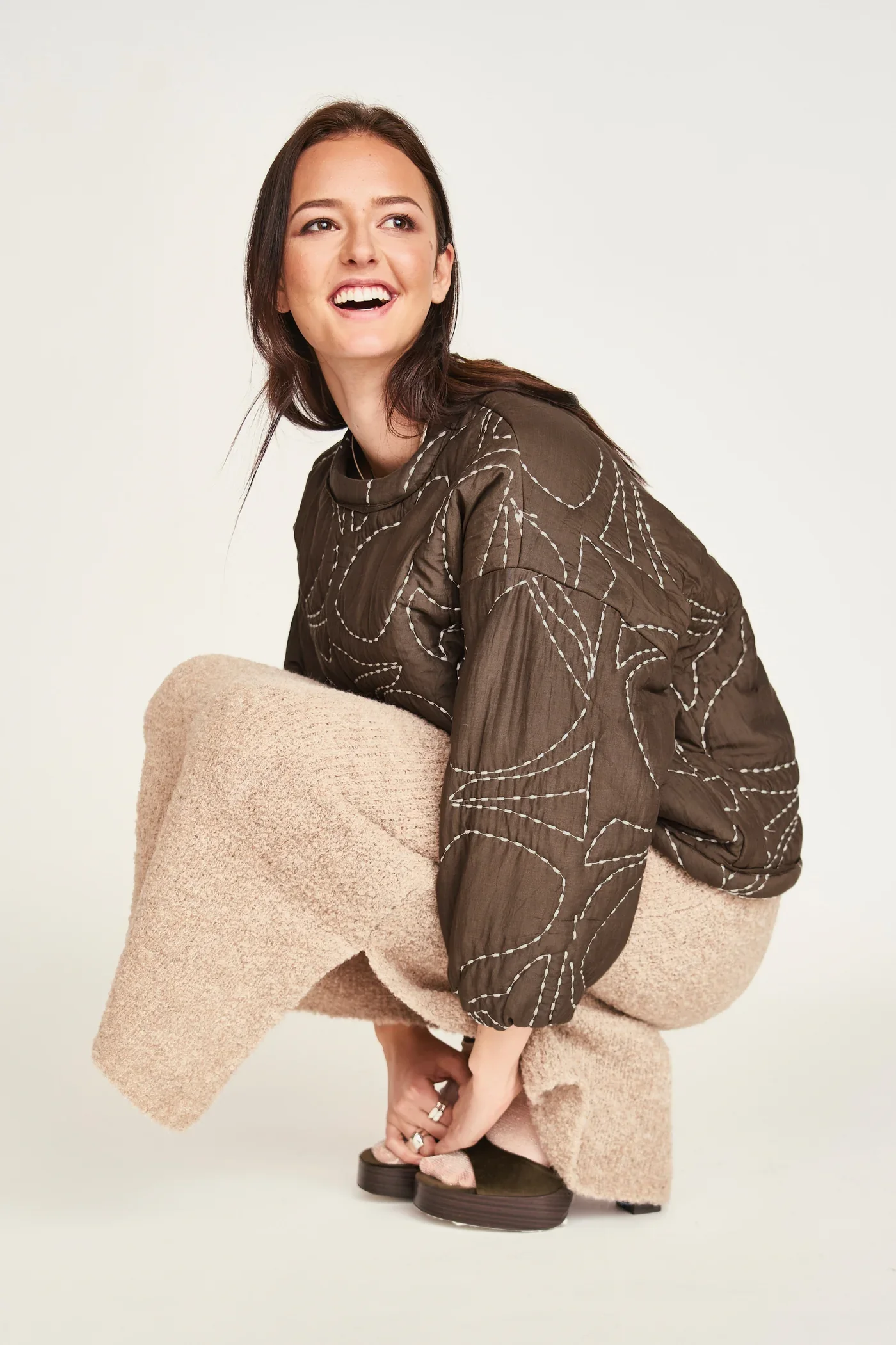 For Mirth, that throughline has always been their playful approach to pattern. In wovens, prints do the heavy lifting. But when it came to knitwear, traditional printing methods weren’t an option and early attempts left knits feeling disconnected from the rest of the line.
